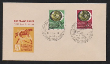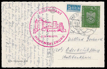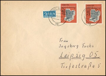 10 Pfg. IFRABA auf portoger. EF auf Ortsbrief, sowie 20 Pfg. als EF auf Auslandskarte und als MeF per zwei auf Doppelbrief