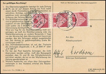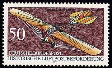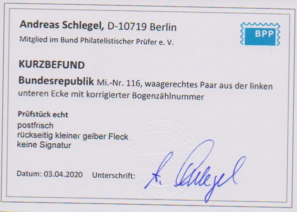 50 Pfg. Historische Luftbeförderung mit braunem statt blauem Hintergrund (Vergleichsstück anbei). Zu dieser Besonderheit gibt es verschiedene Meinungen und die Herkunft ist ungeklärt. Ein beiliegendes Attest ordnet diese Marke als Farbprobe ein, ein weiteres Gutachten (Kopie) der FOGRA schließt Manipulationen aus