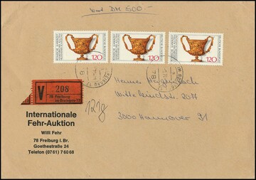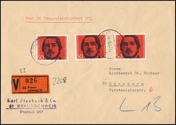 Jahrgänge 1970/71, fünf portogerechte Belege mit ungewöhnlichen bzw. hohen Mehrfach-Frankaturen seltener Wertstufen: Nr. 634 per drei, 657(3), 663(6), 683 (zweimal per drei, verschiedene Varianten)