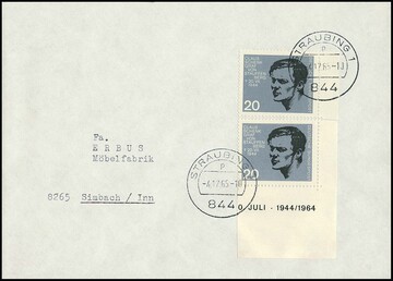 20 Pfg. Leuschner bzw. von Stauffenberg, die Marken aus dem Widerstandskämpferblock je per zwei als gute MeF auf zwei portoger. Briefen, sowie Nr. 438 als EF
