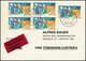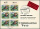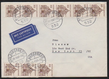 Neun gute portogerechte Mehrfach-Frankaturen: Nr. 736 (aus Olympia-Block!) per fünf auf Lupo-Auslands-Doppelbrief, Nr. 765 per vier (Eilbrief 3. Gew.-Stufe), Nr. 766 per fünf (!), 821 per zwei, 870 per drei, 881 per sechs, 944 per fünf, 952 per vier und 965 per fünf