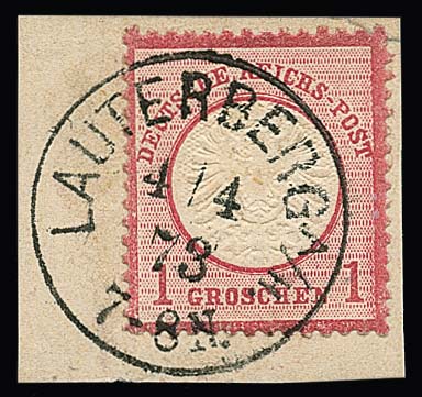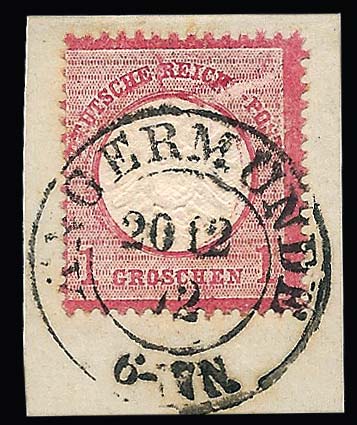 1 Gr. rosa, Kabinettbriefstück mit ganz markant verschmiertem Druckbild (doppelter Innenkreis, REICHS verstümmelt)