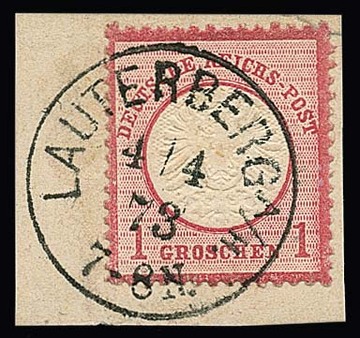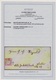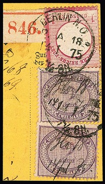 1 Gr. rosa in Währungsmischfrankatur mit zweimal 2 Mk. violettpurpur auf gelbem Paketkarten-Abschnitt mit K1 "Berlin N.O. P.A. 18" vom 14.1.1875, die beiden 2-Mark-Werte sowohl mit Orts-K1 als auch zusätzlich vorschriftswidrig handschriftlich entwertet. Nur in wenigen Stücken bekannte Mischfrankatur Brustschilde/2 Mark, aus der Slg. Roman Stoebe, sign. Engel, Droese und Attest Brugger "Brustschilde-Seltenheit in sehr guter Gesamterhaltung"