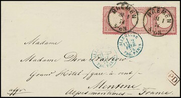 1 Gr. rosa per drei auf Pracht-Couvert von Bremen 1874 nach Mentone/Monaco