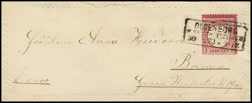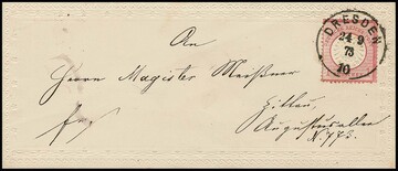 1 Gr. rosa, üblich gezähnt, auf hübschem Präge-Zierbrief mit sowohl vorder- als auch rückseitiger Prägung, mit K1 "Dresden"