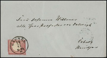 1 Gr. rosa, ungewöhnliches Luxusstück, dreiseitig (!) mit Nebenmarken durch Verschnitt und dadurch überzähnig, siehe Foto, auf Couvert mit K1 "Cassel", so sehr ungewöhnlich!