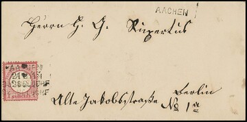 1 Gr. rosa, Prachtstück auf Bahnpostcouvert (rechts Tintenspuren) mit seltenem Stations-L1 "Aachen" und Zug-L3 "Aachen-Düsseldorf", Attest Brugger