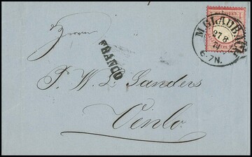 1 Gr. rosa, Kabinettstück ohne den sonst bei dieser Korrespondenz meist vorkommenden Briefbug einzeln auf Grenzrayon-Brief mit K2 "M. Gladbach" 1874 nach Venlo in Holland. Mi. 180,-