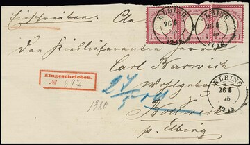 1 Gr. rosa, Paar und Einzelstück (ein Zahn bzw. zwei kurze Zähne) auf seltenem Ortsbereichs-Einschreibebrief mit K2 "Elbing", 26.5.75, in den eigenen Landbezirk nach Bollwerk und retour. Brief links unten verklebter Aktenschnitt, erster R-Zettel