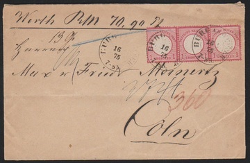 1 Gr. karmin, Kabinett-Dreierstreifen auf Wertcouvert (Faltspur ausserhalb) mit besserem Preußen-K2 "Burg a.d. Wupper", 16.1.1875