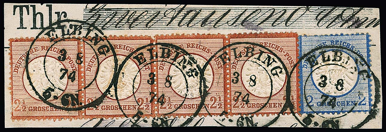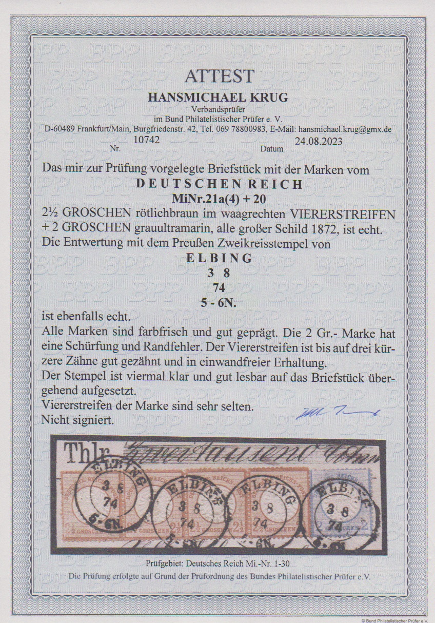2 1/2 Gr. rotbraun, waagerechter Viererstreifen (drei verkürzte Zähnchen ausgabetypisch), nebst 2 Gr. blau (diese kleine Mängel) auf Briefstück mit K2 "Elbing". Das Briefstück stammt erkennbar von einem Wertbrief und der Streifen dürfte vom Absender vorfrankiert worden sein (statt auf Wertbriefen vorschriftsmäßig einzeln zu frankieren), anderenfalls wären wahrscheinlich vom Postbeamten die bekannten "Elbinger Postfälschungen" der 5-Gr.-Marke zwecks Eigenverdienst desselben verklebt worden. Als Viererstreifen (Mi. 1600,-) "sehr selten", wie auch das aktuelle Attest Krug bestätigt