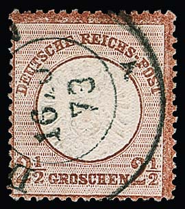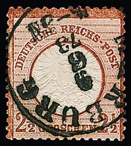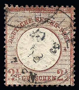 2 1/2 Gr. lilabraun, gestempeltes Prachtstück (unbed. Aufklebeknitter oben), Attest Brugger "schöne Gesamterhaltung". Mi. 700,-