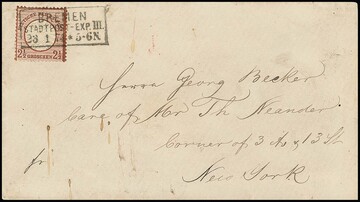 2 1/2 Gr. rotbraun, kleine Marke L14, Prachtstück auf Überseecouvert (leichte Gebrauchsspuren) von "Bremen Stadtpost-Exp. III" (Ra3) nach New York, sign. Engel
