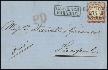 2 1/2 Gr. lilabraun auf Kabinettbrief mit besserem Bahnpost-Stations-Ra2 "Gladbach Bahnhof" und Zug-L3 "Düsseldorf-Aachen" nach Liverpool. Attest Krug. Mi. 1200,- + Stempel