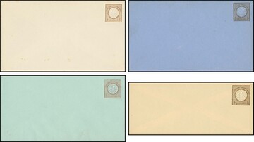 Brustschild-Ganzsachen auf Privatbestellung, 5 Gr. braun, vier verschiedene ungebrauchte Couverts, PU7A1 (Fouré?), PU79c (Moens), PU7A10a (etwas fleckig) und PU7A10c (Fouré), alle sehr selten! Ein Befund Brugger