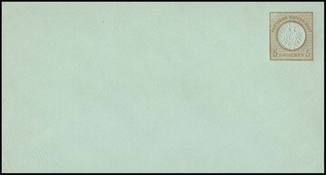Brustschild-Ganzsache auf Privatbestellung, 5 Gr. braun auf grün, Moens, tadellos ungebrauchtes Couvert