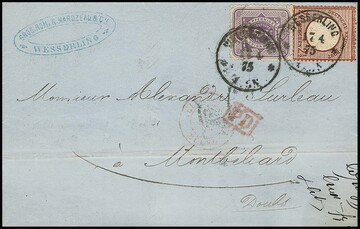 2 1/2 Gr. rotbraun in Währungs-Mischfrankatur mit 5 Pfge. lila auf Auslandsbrief (übliche Mittelfalte) von Wesserling, 17.4.1875, nach Frankreich. Die 2 1/2 Gr. kleine Randkerbe/Eckbugspur. Währungs-Mischfrankaturen kommen sonst meist mit der Nr. 29 vor, mit der Nr. 21 sind sie selten (Wiegand 11 Briefe gelistet, davon einer aus gleicher Korrespondenz), Attest Krug