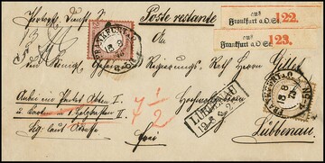 2 1/2 Gr. rotbraun und 5 Gr. ockerbraun, gut geprägte Kabinettstücke auf Paketbegleitbriefvs. mit K2 "Frankfurt a.O."