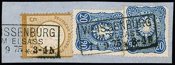 5 Gr. ockerbraun, Kabinettstück in Währungs-Mischfrankatur mit zweimal 20 Pfge. blau (eine "eckrund") auf Briefstück mit Ra3 von Weissenburg/Elsaß, spät verwendet 7.9.1875, Attest Krug