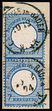 7 Kr. blau, tadelloses senkrechtes Paar auf Briefstück mit K1 von Carlsruhe, sign. Krug. Mi. 280,-