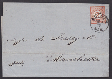 2 1/2 a. 2 1/2 Gr. rotbraun, spät verwendetes Prachtstück mit K1 "Bremen 28.4.75" auf gef. Brief nach Manchester, sign. Sommer