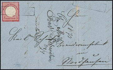 3 Kr. karmin, Kabinettstück mit gut sichtbarem Plattenfehler "beschädigter Innenkreis" auf Faltbrief (typische Falt- und sonstige Gebrauchsspuren) mit seltenem Taxis-Postablage-Ra2 "Liebenstein-Immelborn", Attest Brugger. Mi. 1000,- + Stempel. Aus unserer 136. Auktion 2011