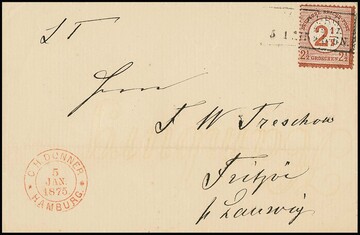 2 1/2 a. 2 1/2 Gr. rotbraun, Kabinettstück auf Faltbrief im Aufbrauch mit besserem Ra3 "Hamburg E.P.B. No. 17" vom 5.1.1875 nach Norwegen, Fotoexp. Brugger