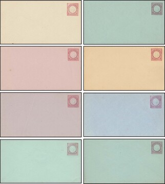 Brustschild-Ganzsachen auf Privatbestellung, 3 Kr. rosa, acht verschiedene ungebrauchte Couverts: P10A1c, PU10A2a, b, c, d, sowie PU10A3a und c, alles äusserst seltene und nur in einer kleinen Auflage verausgabte Couverts, Hb. 14.000,- DM, teils sign./Attest