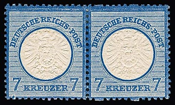 7 Kr. blau, ungebrauchtes Kabinettpaar, linke Marke (Feld 77) Plattenfehler "Rahmenbruch unten unter der linken Wertziffer", die rechte Zähnungsbesonderheit FZL ou 2 u. 8 (oben und unten). Fotoexp. Krug