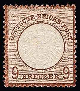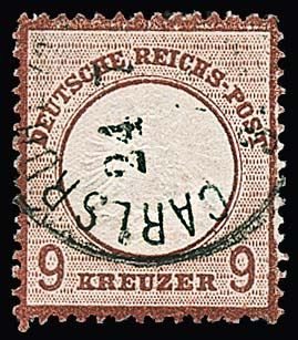 9 Kr. lebhaftlilabraun, Kabinettstück in teils rauher Zähnung, K1 von Carlsruhe, Attest Hennies als Nr. 27b (damals war die Nr. 27c noch nicht im Michel gelistet), Mi. 1700,-