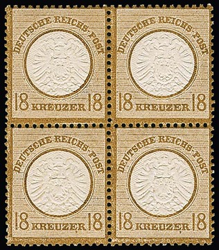 18 Kr. ockerbraun im postfrischen Viererblock, dabei beide unteren Marken Plattenfehler "Punkt unter zweitem E von KREUZER" (auf den Bogenfeldern 74 bis 77 paarweise vorkommend), sign. Sommer. Mi. der normalen postfrischen Einzelmarken 880,- + Plattenfehler