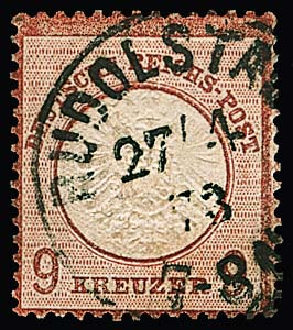 9 Kr. rötlichbraun, Kabinettstück mit K1 von Rudolstadt, Fotoexp. Krug. Mi. 500,-