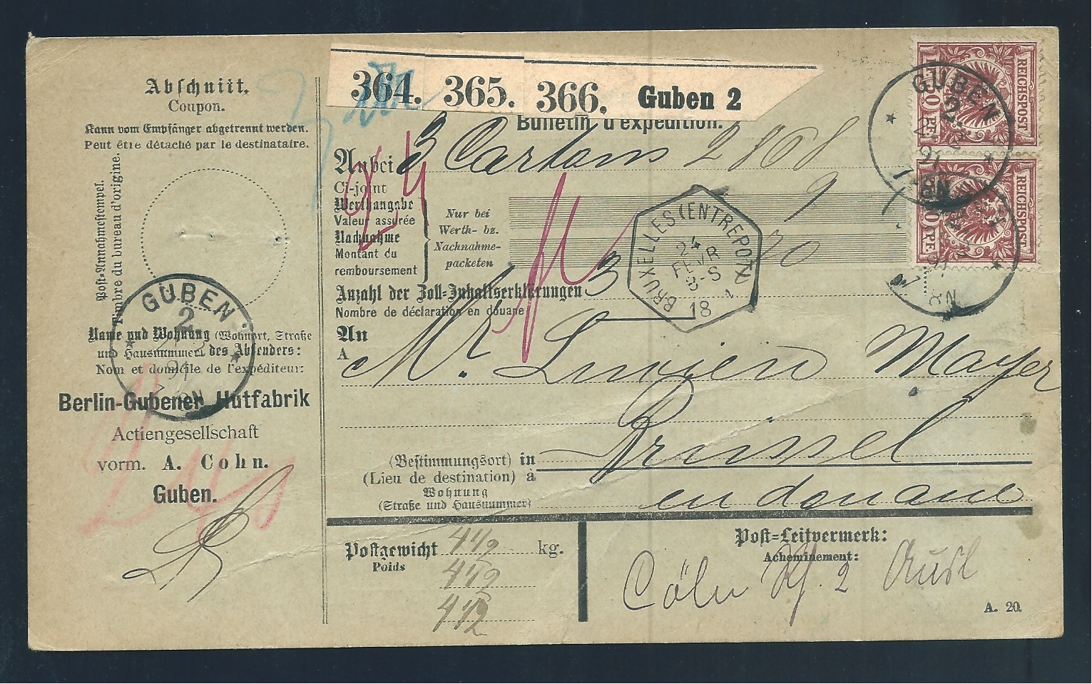 50 Pfg. braunrot, zwei Paare, nebst Paar 20 Pfg., auf kpl. Auslands-Paketkarte aus Guben 1891 nach Brüssel, sign. Petry. Mi. 300,-