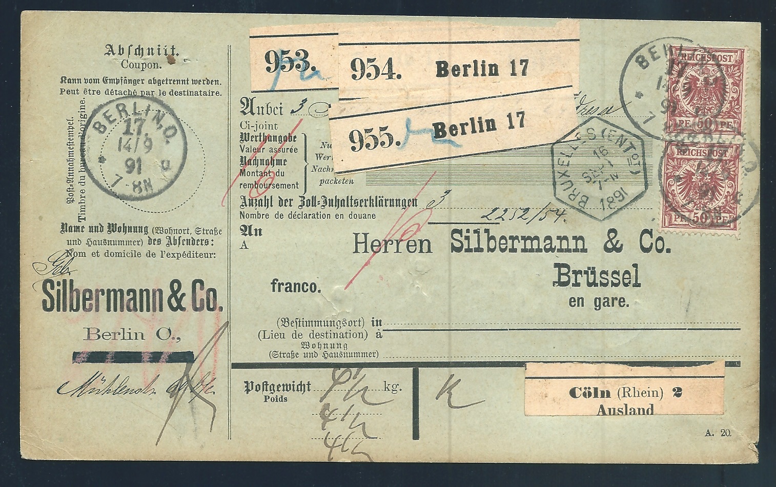 50 Pfg. braunrot, zwei Paare, nebst Paar 20 Pfg., auf Auslands-Paketkarte (Formular typische Gebrauchsspuren) von Berlin 1891 nach Belgien, sign. Petry. Mi. 280,-