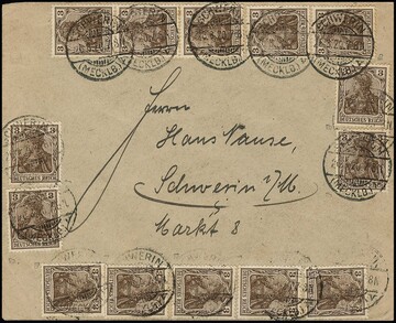 3 Pfg. schwarzockerbraun, 13 Exemplare, nebst einmal die billige dunkelorangebraune Nuance, auf Ortsbrief aus Schwerin 1920, um 2 Pfg. überfrankiert. Nur die 13 lose gest. Nr. 84IIb werten schon 1820,- Mi., so sehr ungewöhnlich, sign. Jäschke-L.