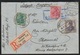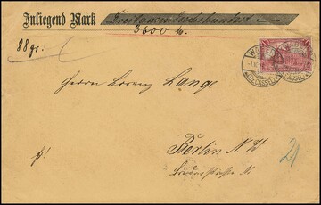 Fünf bessere Belege: R-Brief mit Nr. 87II u. 99, Wertbrief mit Nr. 88 u. 89Ix, Oberrandstück 40 Pfg. (Nr. 90IIw) auf Brief, Nr. 91Ix im Paar als MeF auf Paketkarte nach Norwegen, sowie 1 Mk. Friedensdruck als Einzelfrankatur auf Wertbrief (Nr. 94AI)
