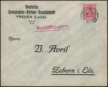 10 Pfg. (mit Firmenlochung) einzeln auf seltenem Inlandscouvert "Geschäftspapiere" aus Grünenplan 1918, vorschriftsmäßig nicht verschlossen
