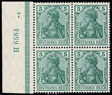 5 Pfg. smaragdgrün im von der guten Farbe seltenen HAN-Viererblock mit HAN "6584". Die linke obere Marke ist ungebraucht, die restlichen postfrisch. Mi. lose Marken 585,- + HAN! Attest Jäschke-L.
