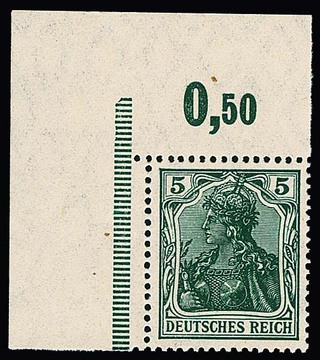 5 Pfg. schwärzlichopalgrün als tadellos postfrische linke obere Bogenecke, sign. Infla. Mi. 800,- +