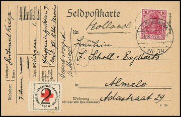 10 Pfg. dunkelrosarot, Friedensdruck (ein minimal verkürzter Zahn), als seltene Einzelfrankatur auf Feldpostkarte mit FP-Stempel, 4.3.1915, nach Almelo/Holland. Mi. "-.-" (nur für die Mischfrankatur schon 6000,-!), Attest Jäschke-L.