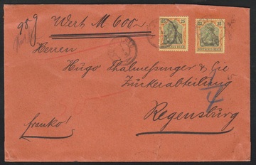 25 Pfg. per zwei als bessere Mehrfach-Frankatur auf Wertbrief mit altem Württemberg-K2 "Künzelsau" 1905 nach Regensburg