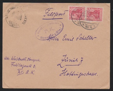 5, 10 u. 15 Pfg. auf Feldpost-R-Brief von der Front mit entspr. R-Zettel und Briefinhalt (u.a. Gepäckschein) 1918, sowie 10 Pfg. im Paar auf Feldpost-Auslandsbrief mit Zensur 1915, typische Gebrauchserhaltung