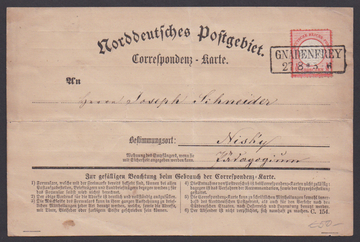 1/2 Gr. ziegelrot, Kabinettstück mit sehr schön klarem Ra2 "Gnadenfrey" auf gefalteter Correspondenzkarte (NDP-Formular)