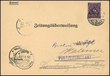 2 Mk. Posthorn als seltene Einzelfrankatur auf Zeitungsüberweisung (Karte min. Randriß) von Berlin-Halensee nach Homburg und retour, sign. Infla, Winkler