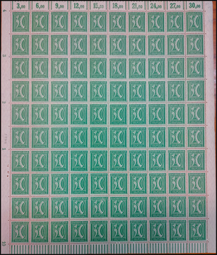 30 Pfg., kpl. postfrischer Bogen mit Plattenfehler I, "Keil in der 0", sechsmal (Felder 10, 14, 15, 40, 54, 65) in unterschiedlichen Ausprägungen