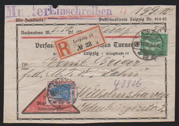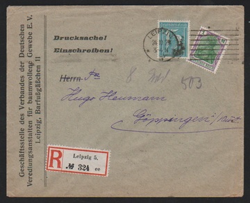 2 Mk. u. 30 Pfg. auf Adresse einer R-NN-Mustersendung aus Leipzig 1921, typische Gebrauchsspuren, seltene Portostufe