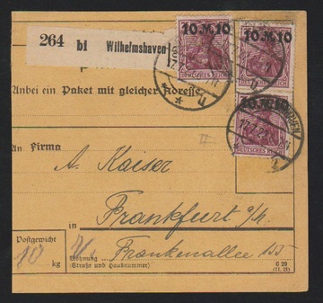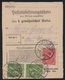 10 M. a. 75 Pfg. per drei als Mehrfach-Frankatur auf Inlands-Paketkarte 1922, sign. Infla