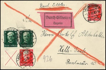 15 Pfg. Hindenburg-Andreaskreuz-Zusammendruck postfrisch und auf Expreß-Brief, je innerhalb eines Viererblocks, Mi. 550,-