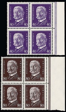 Reichspräsidenten einheitlich im postfrisch ungefalteten Viererblock-Satz vom rechten Bogenrand, unsigniert. Bei der 80 Pfg. die linke obere Marke ein kurzer Zahn, sonst gut. Mi. lose 4400,- (bzw. ohne die 80 Pfg. mit dem kurzen Zahn 4060,-)