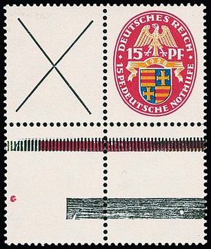 15 Pfg. Nothilfe, waagerechter Andreaskreuz-Zusammendruck postfrisch mit unten zwei kpl. vierseitig gezähnten Leerfeldern (in der Zähnung vorgefaltet), sign. Schlegel. Mi. 2000,-